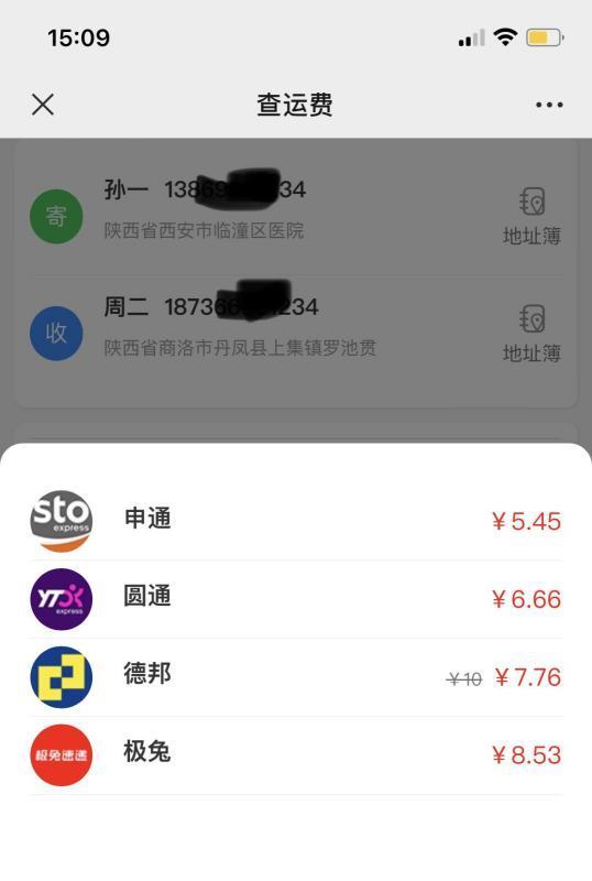 点击查询后,以下为几家快递企业的价格:申通为5.45元,圆通为6.66元。如果选择在这些官方快递企业下单寄快递,会稍微贵一些。而若选择蹦熊快递寄件,需要提前将包裹打包好,快递员上门取件。请注意哦。