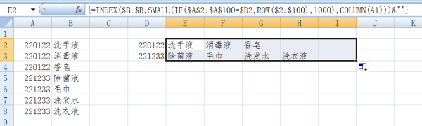 =INDEX($B:$B,SMALL(IF($A$2:$A$100=$D2,ROW($2:$100),1000),COLUMN(A1)))&””