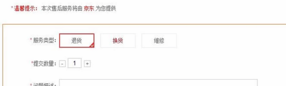 3.进入退货申请页面后,选择“退货”的服务类型,提交数量,退货问题描述,有问题上传商品图片,填写提货方式,收货人电话地址后提交审核。