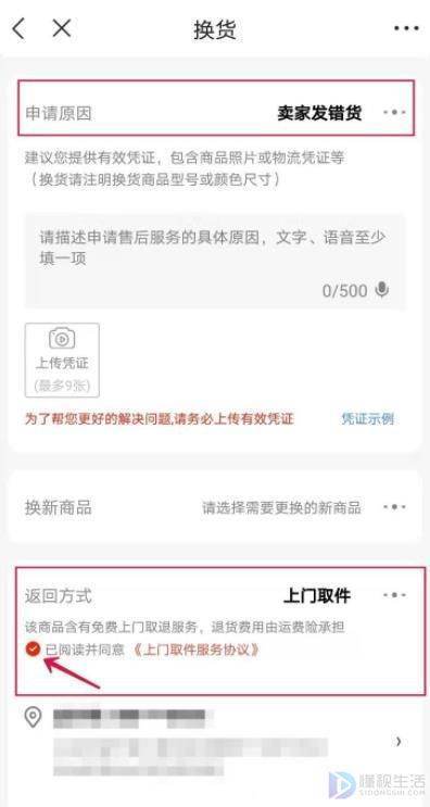 3、选择退换货理由,选择返回方式中的“上门取件”,已阅读并同意勾选“《上门取件服务协议”。