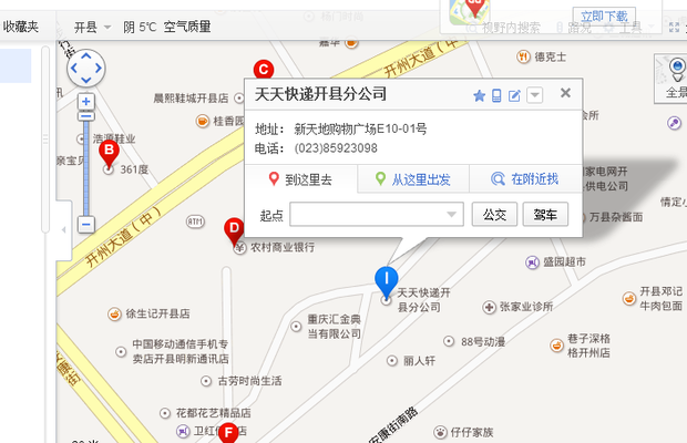 天天快递开县代收点在哪里 物流问答 快递鸟 in 08 9月 2023 物流轨迹API 注册免费接入 物流查询接口 同城配送 电子面单API 物流全链路监控 在线咨询 官网给出的信息是 E1-01号(永辉超市后面)开县新天地购物广场 具体见截图 下图是百度地图 如果自取的话 最好再电话确认下 避免地址信息发生变化 如果手机看不清楚 保存后请查看大图 ← Previous Post Next Post →