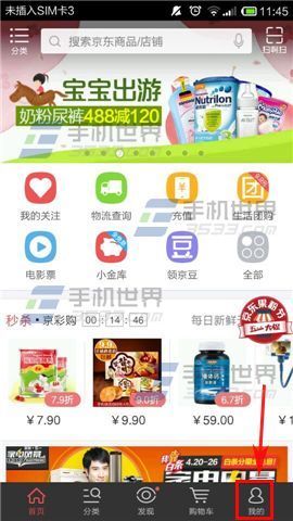 1)打开【京东】,进入点击主页右下角[我的右下角]按钮。(如下图)