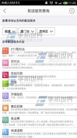3)跳转到配送服务查询页面后,选择好地址,下面您将自行牵引服务内容,来看看所在地区有哪些配送服务。(如下图所示)