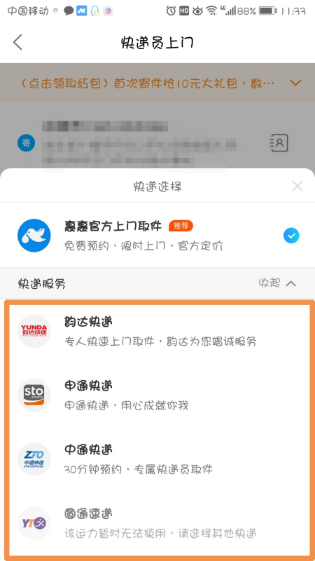 4、可从包裹官方上门取件、韵达快递、申通快递、中通快递等方面选择快递;