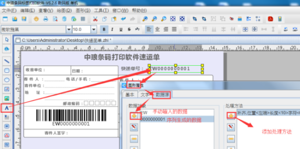添加快递单号。画一篇普通文章本文记录了普通文本的图形ID(在“图形属性”-“基本”选项中可以查询图形ID)在数据源中,图形属性窗口手动添加固定数据“EW然后点击左边的“ “添加另一个数据,选择序列生成数据类型,在右边的处理方法中添加一个“10”长度的补充处理方法。(补充处理方法根据自己的需要,法中的长度取决于自己的需要要设置)。