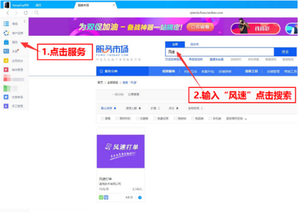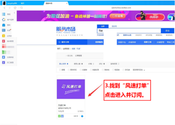 4、进入软件,点击千牛工作台左侧的“风速计费”进入软件。也可以参考下图,在卖家中心进入输入:卖家中心-我购买的应用-找到“风速计费”。
