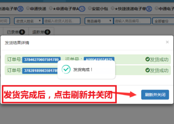 7、打印完成后,发货窗口会自动弹出,点击发货。