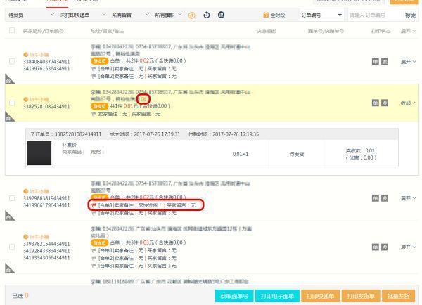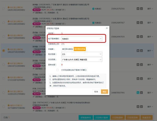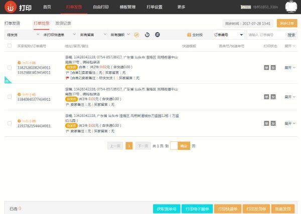 第三步,可以按订单状态、订单打印、留言情况等筛选订单,也可以按时筛选订单,也可以按时筛选订单输入买家昵称或订单编辑搜索订单的号码,检查需要获得面单点击“获取面单号”订单,获取相应的电子表面单号。