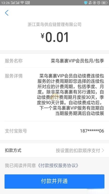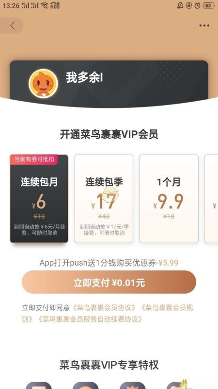 3、进入菜鸟包裹会员打开界面后,选择打开会员的时间,点击“ 立即支付 如下图所示: