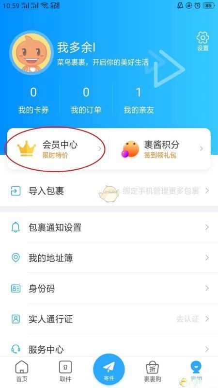 1、菜鸟包裹“在菜鸟包裹” 我的 点击“界面” 会员中心 如下图所示: