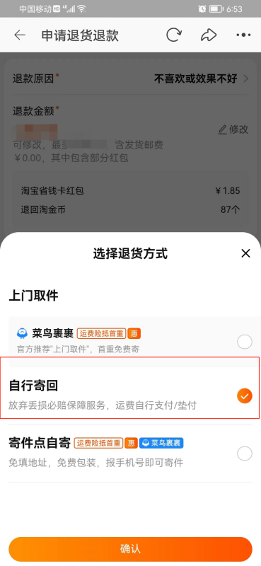 3、注意!这里退货方式不要选择上门取件,选择自己寄回去,因为要带到丰巢柜自寄;