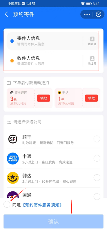 3、填写寄件人和收件人的信息,寄件人就是你自己,收件人就是你想把快递发给对方的人,然后选择发送什么快递,在J的第一面检查,勾选缓宏同意须知击确认;