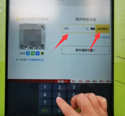 3、此历清时,电子屏幕上的页面跳转到输入取件码页面,我们将取件码输入文本框,然后点击表面“点击取件”。