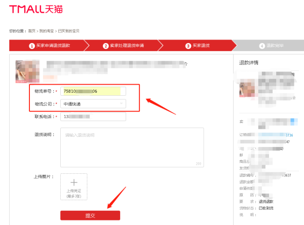 这样,就可以填写退货单号,等待卖方收到到货可以退款给你。