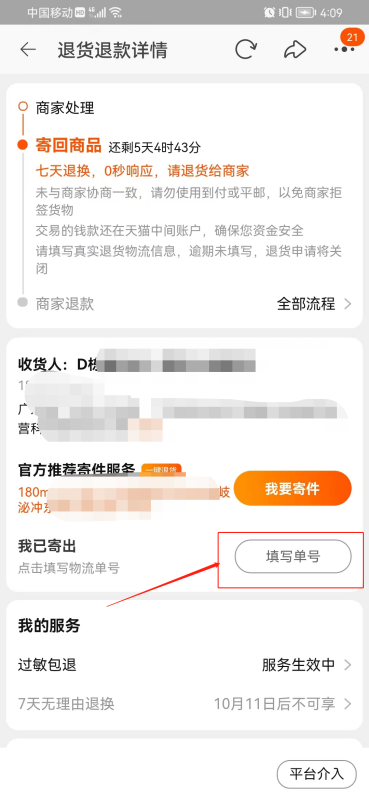 3、点击进入内部 我已寄出 填写单号;