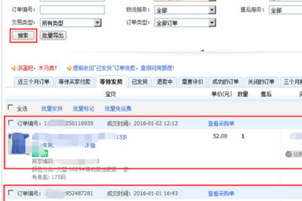 3、然后点击“搜索”页面会弹出买家所有已付但尚未在内发货的订单。