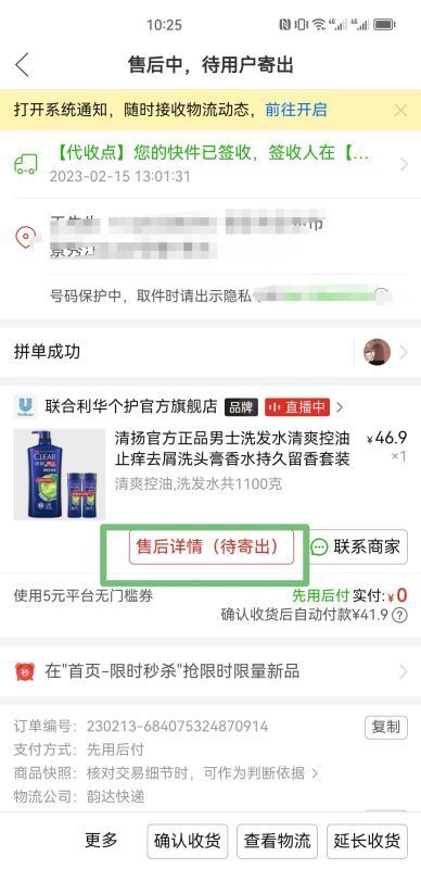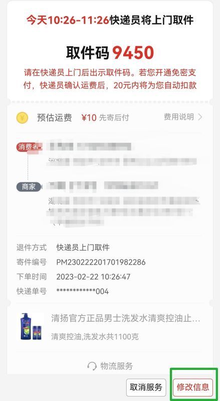 04、陪斗点铅大击发出后,快递员上门取件码,选择右下角的修改信息可以修改取件地址的信息。
