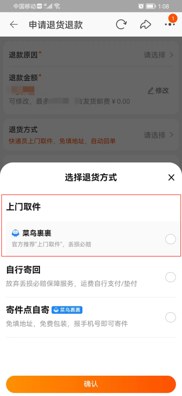 5、如果你不喜欢/不想要,选择退款的原因选择上门取货的方式(有些偏远地区没有这样的服务必须选择自己寄回);