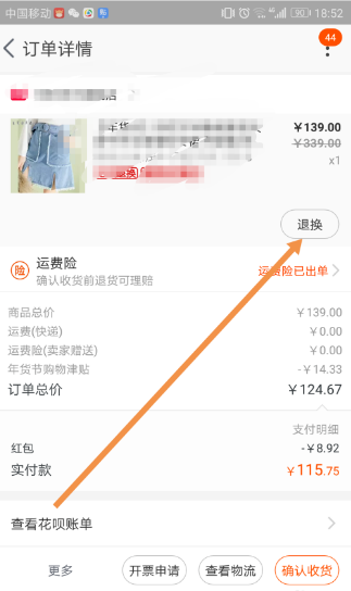 2、点击进入订单后,可以看到箭头所指的退换功能。