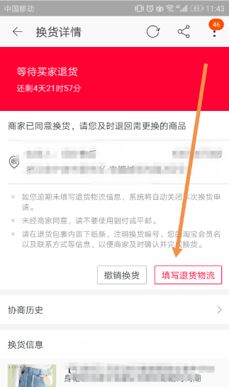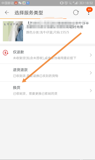 2、点击进入订单后,可以看到箭头所指的退换功能。