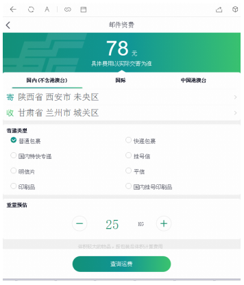 请查看一件普通邮政包裹,编号为25。收费标准以公斤为单位,仅供参考。