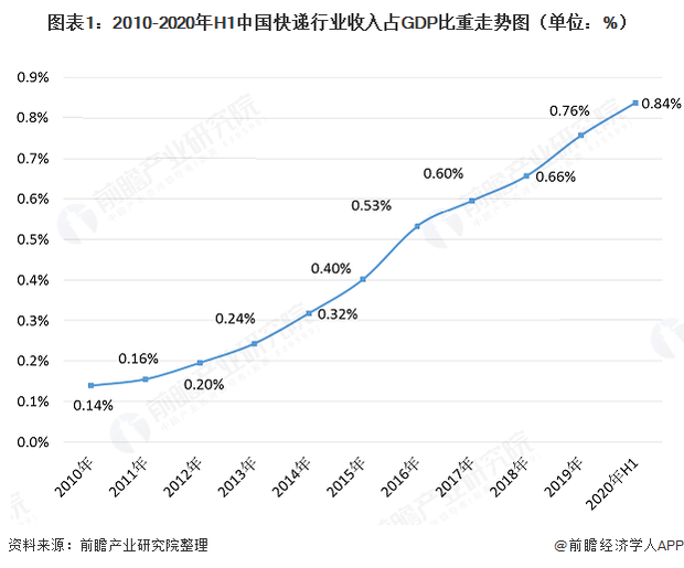 2010-2019年,快递业务收入占GG业务收入DP比例呈上升趋势。2019年占0.76%。2020年上半年,快递行业收入占GDP比例增长到0.84%,国内快递行工业在经济发展中发挥着越来越重要的作用。