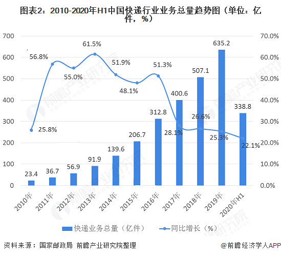 2010-2019年,我国快递行业总业务量保持逐年增长趋势。2019年,快递服务企业累计业务量达到635.2亿件比增长25.3%。2020年上半年,全国快递服务企业累计业务量达到338.8亿件,同比增长22.1%,反映了快递行业的规定模型逐渐扩大。