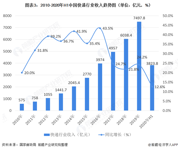 2010-2019年,中国快递业收入保持逐年增长。2019年,全国快递业务收入累计完成7497.8亿元,同比增长24.2%。2020年上半年,快递业务累计收入3823.8亿元,同比增长12.6%,展示快递行业的运输营地发展较好。