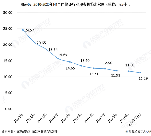 服务价格=业务收入/业务量大致估计每一个快递平均价格。2010-2020年上半年,我国家快递服务价格呈下降趋势,2020年上涨半年快递平均服务价格11.29元/件,比2019年低0.51元/件,快递进一步降低成本,从而提高客户满意度。