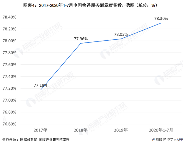 根据国家邮政局公布的快递服务满意度指数,2017-2019年呈逐年上升趋势,2020年1-7日月份快递服务平均满意度达到到78.3%,反映出行业服务水平不断提高。