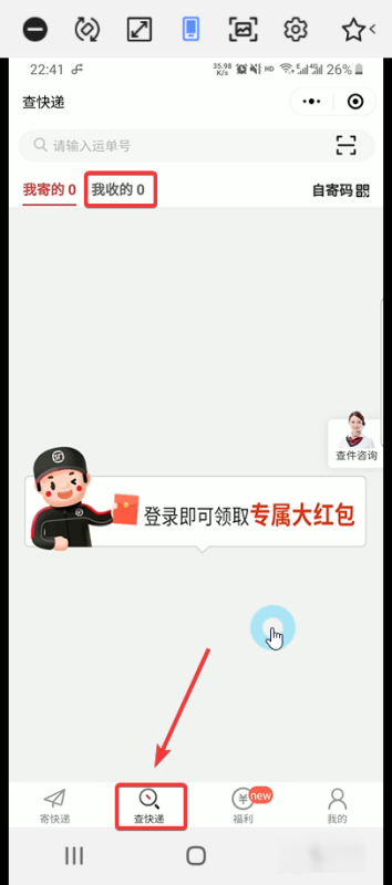 7、登录完成后,单击下面的导航栏查快递,然后在页面上“我寄”是的,你可以看到我发送的快递单列表,页面上的“我收到的”可以看到我想收到的到达快递单列表。