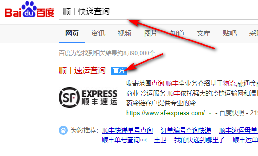 扩展资料1、比如要查询顺丰快递,百度搜索顺丰快递查询,点击进入官网。