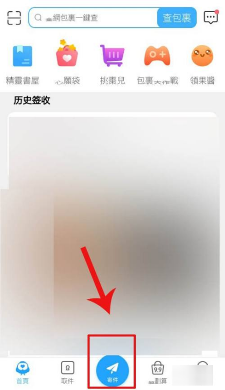1、打开菜鸟裹裹点击中间的[寄件]。
