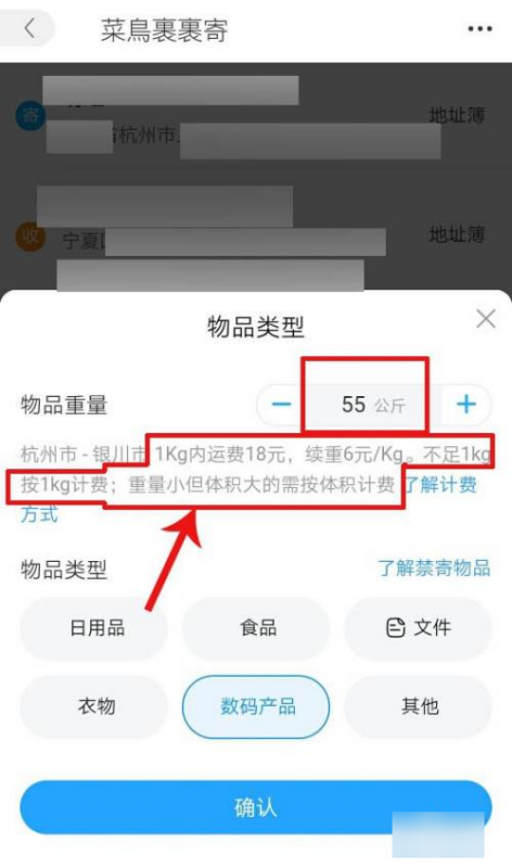 3、若在选择物品重量时,如需续重每【增加一公斤】。