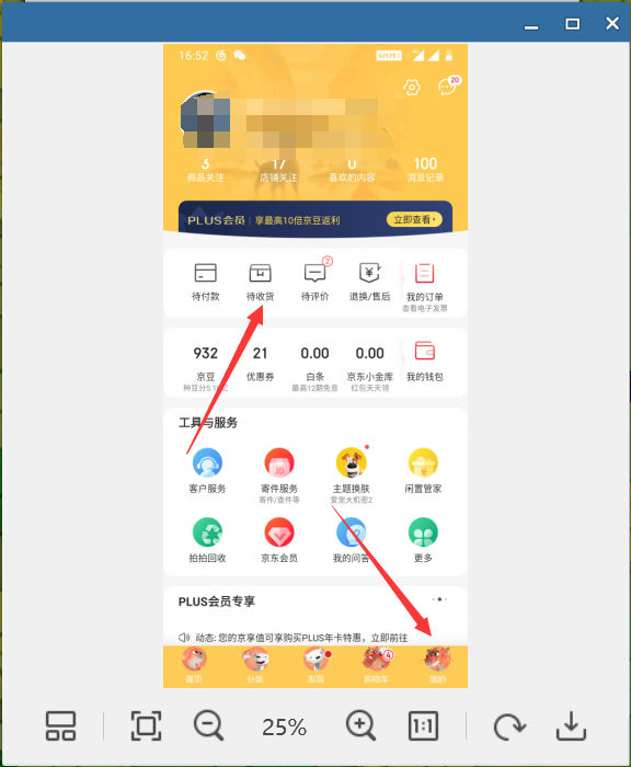 2.接下来进入京东商城页面,在箭头处挑选我的,然后挑选待收货。