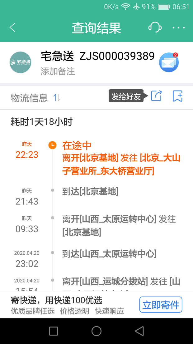 ZJS000039389000宅急送快递单号查询 物流问答 快递鸟 in 03 1月 2023 物流轨迹API 注册免费接入 物流查询接口 同城配送 电子面单API 物流全链路监控 在线咨询 你好。宅急送快递单号查询的成果显现。昨日22:23正在运送途中。正在发往北京大山子 营业所。 你能够在手机上下载快递100。然后输入快递的运单号。再点击右边的按钮。点击后就能够检查和盯梢快递的运送状况了。 ← Previous Post Next Post →