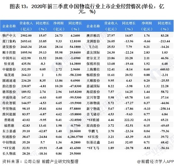 从职业界上市企业运营收入规划来看,2020年前三季度物流业43家上市公司营收排名首位的是物资中大,营收达2902.00亿元,远远高出职业上市企业均值293.26亿元,为职业均匀的9.9倍,一起43家上市物流企业营收高于职业均匀水平的有7家,其间营收规划均达1000亿元以上,名列前四的分别是物资中大、厦门象屿、建发股份和顺丰控股;从营收增幅来看,有21家上市企业完成正增加,其间增加幅度最大的是欧浦的222.32%;22家上市企业为负增加,降幅最大的是东方嘉盛的-62.87%