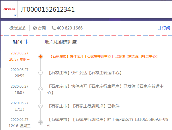上图是快递信息,前天晚上现已从石家庄发货,现在正在发往东莞的路途中。