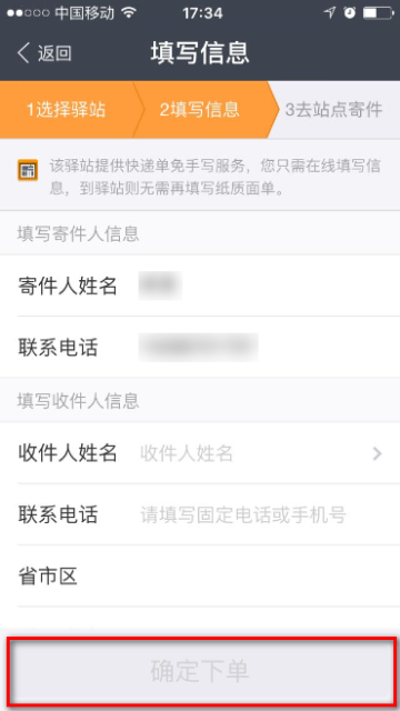 5 填写寄件人信息和收件人信息,点击【确认下单】
