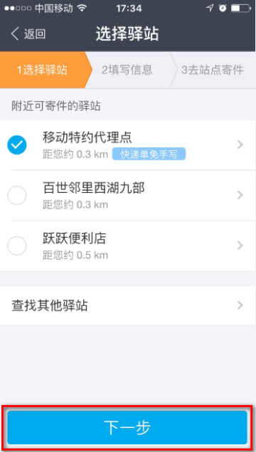 4 挑选适宜的菜鸟驿站站点,点击【下一步】