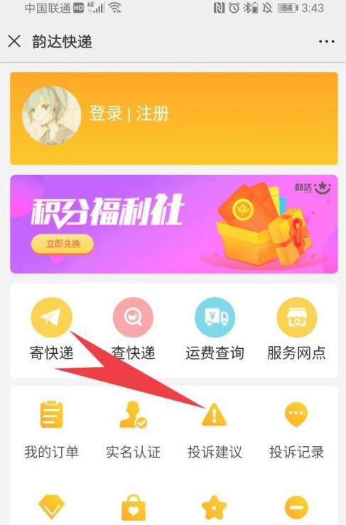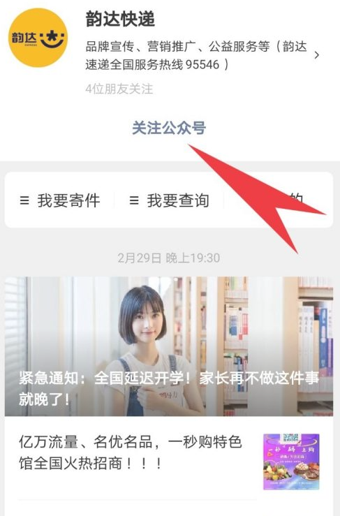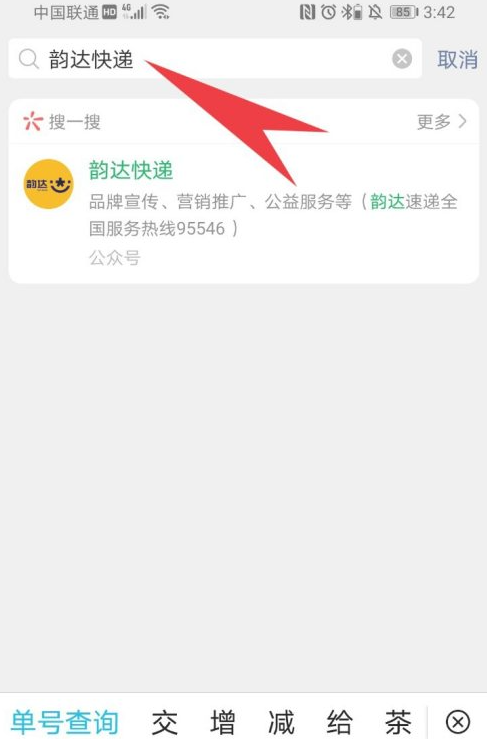 2、在查找栏中查找“韵达快递”,不必点查找,最上面弹出的便是韵达的官方微信