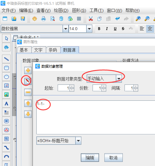 1、点击制作一维条码,鼠标双击制作的一维条码,弹出”图形特点“,点击修正,数据目标类型挑选”手动输入“1-1-。