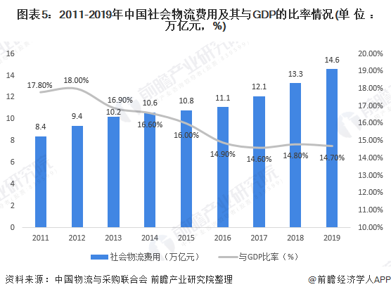 2019年,我国社会物流总费用为14.6万亿元,与GDP比率为14.7%,较2011年下降3.1个百分点,结合长期以来我国GDP总量的较大规划来看,现阶段我国物流本钱操控力度较以往有明显提高,物流功率有所提高。