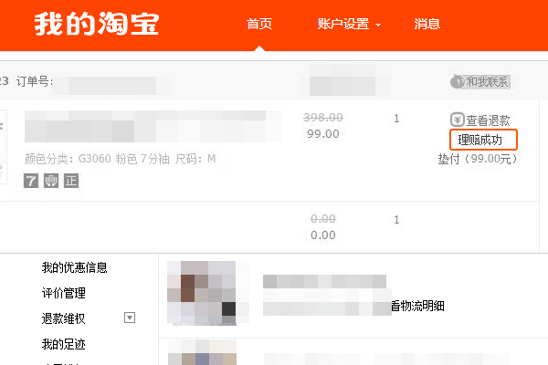 4、若理赔成功,订单将会如下展现:点击理赔成功,即可检查理赔金额以及到账信息。